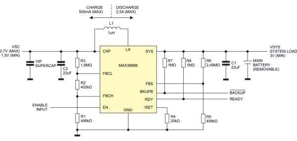 Jedną z ciekawszych propozycji zaprezentowała firma Maxim, wprowadzając do obrotu układ MAX38888. Jest to „odwracalna” przetwornica DC/DC, umożliwiająca bardzo prostą realizację funkcji zarządzania przepływem energii pomiędzy superkondensatorem, a głównym źródłem zasilania (bateriami lub akumulatorem). Układ umożliwia ładowanie superkondensatora prądem do 500 mA, zaś po zaniku głównego zasilania (np. po wyjęciu baterii) pozwala na zasilanie części systemowej (głównej szyny zasilania urządzenia) prądem do 2,5 A. Co więcej, układ ma możliwość zaprogramowania szeregu parametrów, w tym zakresu napięć roboczych superkondensatora czy też minimalnego napięcia zasilania po stronie systemowej. Schemat aplikacyjny kontrolera MAX38888 został pokazany na rysunku 9.