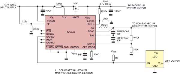 Innym przykładem specjalizowanego kontrolera superkondensatorów jest układ LTC4041. Schemat aplikacyjny układu w aplikacji z dwoma superkondensatorami zaprezentowano na rysunku 10 – wbudowany balancer aktywny umożliwia bezpośrednie podłączenie do kontrolera dwóch superkondensatorów szeregowych. Także w tym przypadku ten sam blok konwertera DC/DC typu buck/boost może pracować dwukierunkowo, obsługując zarówno proces ładowania superkondensatora (-ów), jak i rozładowania do obciążenia.