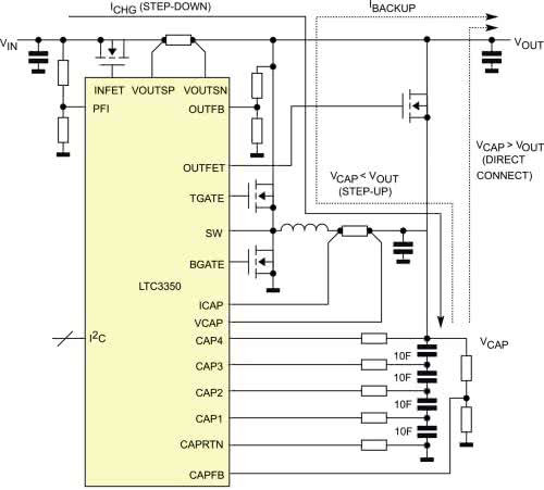 W systemach wymagających wyższych napięć pracy można zastosować rozbudowany kontroler z serii LTC3350, oferowany przez firmę Linear Technology. Układ umożliwia szeregowe podłączenie aż czterech superkondensatorów, oferuje funkcję aktywnego balancera, dwukierunkową przetwornicę buck/boost, a także szereg unikalnych funkcji – w tym 14-bitowy przetwornik ADC do monitorowania napięć, prądów, pojemności, a nawet... rezystancji ESR. Jest także wyposażony w aktywne ograniczniki przeciwprzepięciowe i podwójny kontroler tranzystorów w topologii „idealnej diody”, zapewniający niemal bezstratny transfer energii do/z superkondensatorów. Schemat aplikacyjny układu został pokazany na rysunku 11.