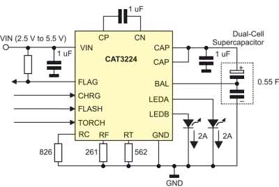 Ciekawą propozycję dla konstruktorów pracujących nad lampami błyskowymi i innymi aplikacjami, wymagającymi dostarczenia silnych impulsów prądowych (do 4 A) do diod LED dużej mocy, przygotowała firma ON Semiconductor. Układ CAT3224 jest jest specjalizowanym kontrolerem superkondensatora, oferującym ponadto dwa wbudowane źródła prądowe o wysokiej wydajności oraz aktywny balancer, umożliwiający podłączenie dwóch superkondensatorów.