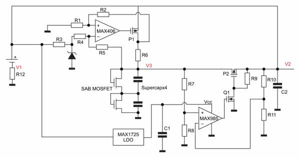 Za ładowanie kondensatorów odpowiada źródło prądowe oparte na wzmacniaczu MAX406, współpracującym z rezystorem bocznikowym R6 (w trybie różnicowym) oraz tranzystorem wyjściowym P1. Komparator MAX985 dokonuje ciągłej kontroli napięcia na kondensatorach oraz na szynie zasilania urządzenia, w razie potrzeby otwierając tranzystor P2, dzięki czemu superkondensatory są dołączane równolegle do akumulatora, wspomagając jego działanie i zapobiegając obniżeniu napięcia zasilania w stanie przejściowym po włączeniu silnego obciążenia.