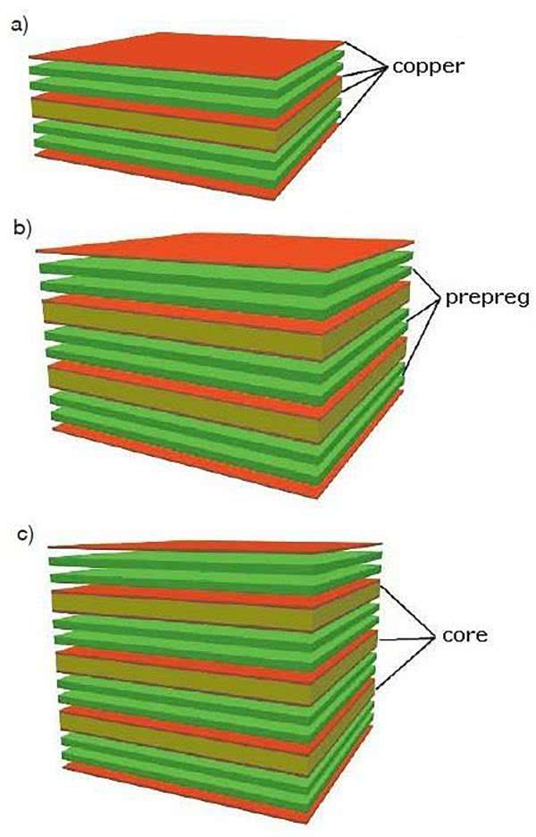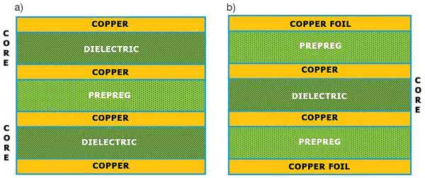 Wielowarstwowe PCB składa się z rdzeni, pokrytych miedzianą folią, które są łączone ze sobą za pomocą prepregów. Rdzenie obwodów drukowanych to wstępnie sprasowane warstwy folii miedzianej z dielektrykiem pomiędzy nimi. Najczęściej dielektrykiem tym jest laminat szklano-epoksydowy typu FR4, jednakże nic nie stoi na przeszkodzie, aby projektować i wytwarzać wielowarstwowe płytki drukowane w oparciu o rdzenie z dielektrykiem w postaci odizolowanej warstwy metalu (dla poprawy przewodności cieplnej), ceramiki (dla zwiększenia zakresu częstotliwości pracy, redukcji prądu upływu itd.) – wszystko w zależności od wymagań projektu.