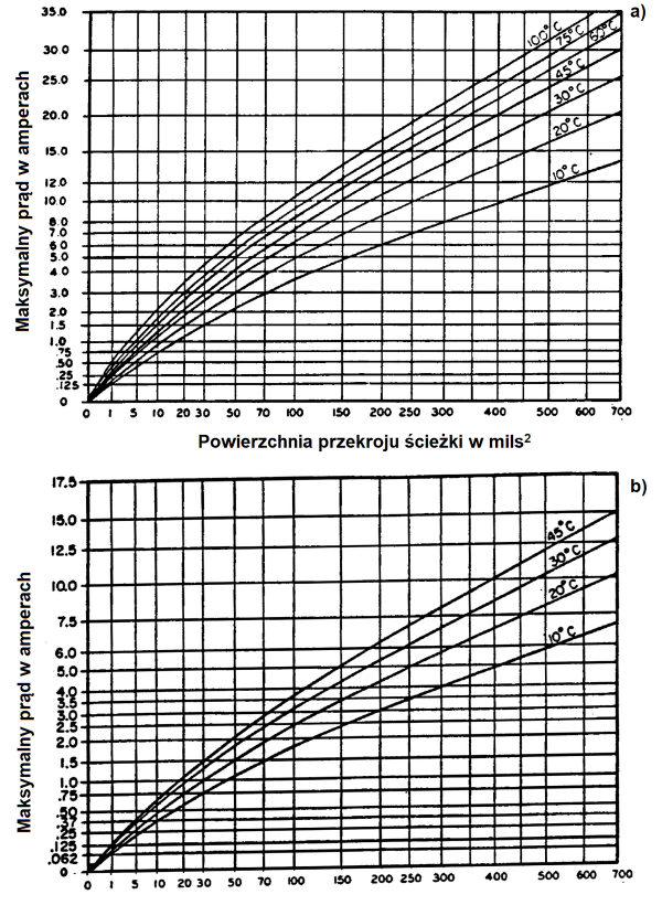 Jeśli chodzi o minimalne wymiary ścieżek, to są one wynikiem wymagań, dotyczących prądu maksymalnego, jakie mają przewodzić. Wynika to z parametrów, jakie zakłada się w normie IPC-2221A, dotyczących maksymalnego wzrostu temperatury ścieżki, dla danego prądu i powierzchni przekroju ścieżki. Wymagania te pokazano na wykresie na rysunku 3a dla ścieżek znajdujących się na zewnętrznych warstwach PCB i na rysunku 3b dla ścieżek, znajdujących się na warstwach wewnętrznych. Wynika to z różnicy w chłodzeniu ścieżek – ścieżki zewnętrzne mogą bez problemu oddawać ciepło do otaczającego je powietrza. Ścieżki wewnętrzne rozpraszają ciepło dużo gorzej.