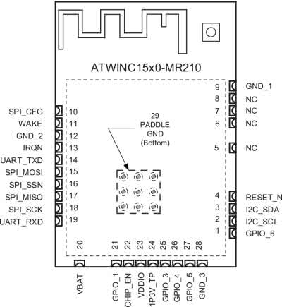 Najobszerniejsza grupa rozwiązań, zapewniająca najlepszy możliwy balans pomiędzy rozmiarami i ceną modułu a łatwością montażu na płytach PCB o małej i średniej gęstości upakowania elementów. Pady lutownicze są wykonane w postaci półokrągłych, metalizowanych otworów, co zapewnia dobre warunki adhezji dla cyny i jednocześnie ułatwia montaż ręczny (na marginesie warto dodać, że wiele modułów tego typu posiada też dodatkowe pady masy, umieszczone na spodniej stronie i możliwe do wlutowania jedynie w procesie rozpływowym). Przykładem tego typu modułu jest ATWINC15x0-MR210xB firmy Microchip (fotografia 1, rysunek 1), dostępny w czterech wersjach różniących się rozmiarem pamięci Flash, sposobem wyprowadzenia linii antenowej (złącze u.FL bądź antena mikropaskowa) oraz zakresem zapewnianej przez producenta certyfikacji. Większość wyższej klasy modułów posiada fabrycznie wbudowaną, niskoprofilową pokrywę ekranującą, zapewniającą niezbędne ekranowanie części cyfrowej (mikrokontroler, pamięć, układy taktowania) oraz radiowej.