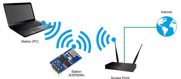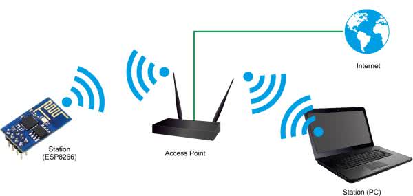 W trybie STA (station) moduł może łączyć się z istniejącą siecią Wi-Fi, tworzoną przez router bądź inny punkt dostępowy (rysunek 4). Moduł jest widziany przez sieć jako jedno z urządzeń końcowych, po włączeniu zasilania konieczne okazuje się zatem programowe skonfigurowanie parametrów dostępu (SSID, hasło sieci zewnętrznej) oraz odczekanie na przydzielenie adresu IP (moduły obsługują protokół DHCP, jednak zwykle możliwe jest też ustawienie stałego adresu). Ten tryb pracy jest zdecydowanie najczęściej wykorzystywany w klasycznych aplikacjach IoT, w których raz skonfigurowany moduł może dowolnie często łączyć się z serwerem aplikacyjnym w celu transmisji danych pomiarowych i odbioru komend sterujących lub informacji zwrotnych.