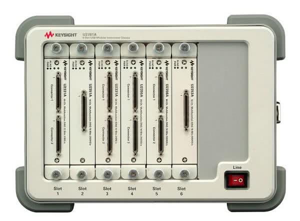 Firma Keysight wprowadziła na rynek, także modułowe oscyloskopy z serii U270xA: U2701A o paśmie 100 MHz i U2702A o paśmie 200 MHz (fotografia 2). Obydwa modele oferują dość standardową częstotliwość próbkowania (1 GSa/s, współdzielona pomiędzy obydwoma kanałami) i rozdzielczość przetworników ADC (8 bitów), przewyższają za to wiele konkurencyjnych oscyloskopów sporą pamięcią próbek, która (dla pojedynczego kanału) wynosi 16 Mpts w trybie normalnym i 32 Mpts w trybie Single-shot. Urządzenia mogą pracować jako niezależne jednostki pomiarowe, zapewniają ponadto pełną kompatybilność z bazą U2781A, stanowiącą chassis systemu akwizycji danych i wspierającą podłączenie nawet do 6 modułów rozszerzeń (fotografia 3). Seria urządzeń kompatybilnych z chassis jest zresztą dużo obszerniejsza i obejmuje, oprócz samych oscyloskopów, także wielokanałowe moduły akwizycji danych, oznaczone numerami katalogowymi U2531A, U2541A oraz U2542A, wielofunkcyjne moduły DAQ U235xA, czy też macierze szybkich przełączników sygnałowych U2751A.