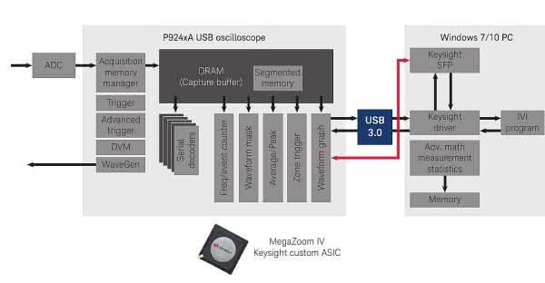 Urządzenia zostały skonstruowane w oparciu o opracowany przez inżynierów firmy Keysight układ ASIC typu MegaZoom IV, którego rdzeń zapewnia sprzętowe wsparcie dekodowania szeregowych interfejsów komunikacyjnych, obsługę masek sygnałowych, zaawansowanych trybów wyzwalania, czy wreszcie… wbudowanego generatora arbitralnego WaveGen o paśmie 20 MHz (rysunek 1). Producent nieprzypadkowo chwali się silną integracją funkcji pomiarowych na poziomie sprzętowym – taka architektura umożliwia bowiem efektywne odciążenie łącza USB 3.0 i procesora komputera nadrzędnego (jak również sterowników systemowych), dzięki czemu urządzenia z serii P924xA są w stanie obsługiwać częstotliwość akwizycji na poziomie aż miliona ramek na sekundę(!).