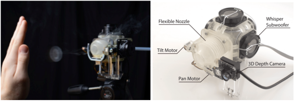 Druga z metod korzysta z wirów powietrznych. Kontrolując różnicę ciśnień pomiędzy dyszą a medium zewnętrznym urządzenie generuje wiry o dokładnie znanej i przewidywalnej geometrii. Metoda ta pozwala wytwarzanym wirom powietrza sięgać na dalsze odległości przy zachowaniu spójnej formy i szybkości. Przykładem generatora wirów powietrznych jest urządzenie AIREAL zaprojektowane przez Disney Research, które zostało pokazane na fotografii 1. Składa się z sześciennej obudowy o wymiarach 8×8×8 cm, elastycznej dyszy o długości 4 cm i silników do obrotu i pochylenia dyszy. Oprócz strony dyszy wylotowej, każda strona modułu ma skierowany do wewnątrz, 2-calowy głośnik basowy o mocy 15 W. Głośniki te pełnią rolę pompy – razem działają jak siłownik wytwarzający sprężone powietrze.