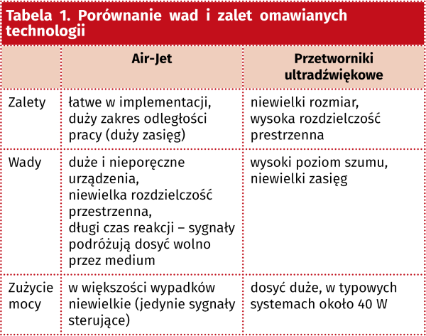 W tabeli 1 znajduje się porównanie opisanych rozwiązań. Metoda wykorzystująca strumień powietrza wydaje się być prostsza w projektowaniu i wdrażaniu w porównaniu z systemami ultradźwiękowymi. Ponadto dotykowe sprzężenie zwrotne wytwarzane przez urządzenie ze strumieniem powietrza może osiągnąć większą odległość. Ma jednak niższą rozdzielczość przestrzenną i wolniej dociera do punktu ogniskowego w przeciwieństwie do urządzenia wykorzystującego metodę ultradźwiękową. Także rozdzielczość przestrzenna systemu ultradźwiękowego jest znacznie wyższa, pozwalając na generowanie naprawdę zaawansowanych interfejsów.