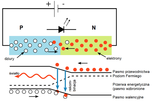 W ten sposób złącze P-N staje się diodą elektroluminescencyjną.