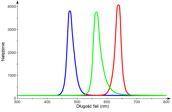 Pierwsze podejście polega na zintegrowaniu w układzie trzech pojedynczych diod LED, które emitują trzy podstawowe kolory – czerwony, zielony i niebieski. Kolory mieszają się ze sobą w celu uzyskania białego światła (rysunek 2). Rozwiązanie to pozwala również na tworzenie lamp RGB. Dzięki możliwości niezależnego sterowania natężeniem każdej z diod LED, możliwe jest uzyskiwanie innych kolorów niż tylko biały.