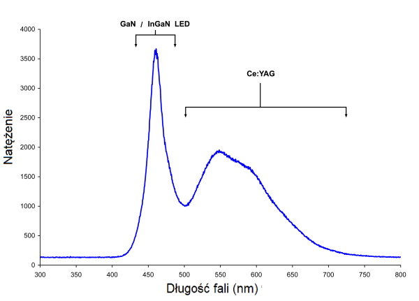 Zastosowanie materiału luminoforowego do konwersji światła monochromatycznego z (na ogół) niebieskiej lub ultrafioletowej diody LED na białe światło o szerokim spektrum (rysunek 3), działa podobne do lampy fluorescencyjnej (świetlówki). Żółty luminofor to najczęściej domieszkowane cerem kryształy YAG. Luminofor YAG powoduje, że światło diody LED zamieniane jest w żółte (fotografia 1), a przestrzeń między kryształami umożliwia przechodzenie niebieskiego światła z diody – tylko jego część jest konwertowana w żółty kolor. Obie barwy wspólnie dają wrażenie światła zbliżonego do białego. Alternatywnie, białe diody LED mogą zawierać inne luminofory, takie jak fluorokrzemian potasu (PFS) domieszkowany manganem (IV) lub inne, specjalnie w tym celu zaprojektowane luminofory. PFS pomaga w generowaniu światła czerwonego i jest używany w połączeniu z konwencjonalnym luminoforem Ce:YAG. W diodach LED z luminoforem PFS część niebieskiego światła przechodzi przez luminofory, luminofor Ce:YAG konwertuje światło niebieskie na światło żółte, a luminofor PFS konwertuje światło niebieskie na światło czerwone.
