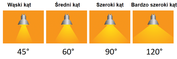 Kąt wiązki światła to kąt, pod którym światło jest rozprowadzane lub emitowane ze źródła. Wiązka światła kształtowana jest w lampie przez optykę – odbłyśnik oraz soczewki, jakie użyte są w lampie. Na rynku dostępne są lampy, które emitują światło pod różnymi kątami od 45 stopni do 120 stopni. Na rysunku 5 porównano ze sobą, w uproszczony sposób, poszczególne rodzaje lamp.