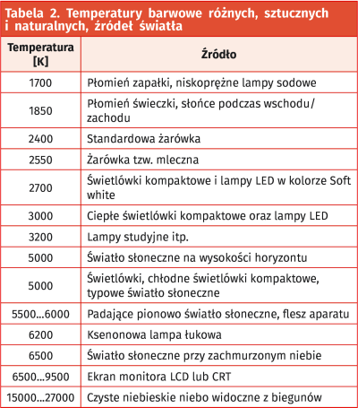 Temperatury barw powyżej 5000 K nazywane są „kolorami zimnymi”, ponieważ są niebieskawe, podczas gdy niższe temperatury barwowe (2700...3000 K) nazywane są „kolorami ciepłymi” (są żółtawe). Ciepły w tym kontekście odnosi się do koloru, a nie temperatury barwnej, bo ta jest zupełnie odwrotna – ciepła barwa światła pochodzi z chłodniejszych emiterów; te o najwyższej temperaturze barwnej w istocie daje światło chłodniejsze. W tabeli 2 zebrano przykładowe temperatury barwne różnych źródeł światła – naturalnych i sztucznych.
