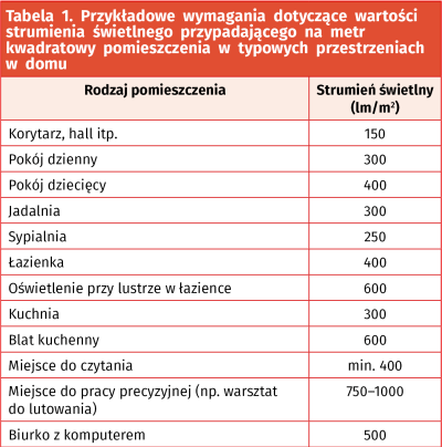 Jeśli chodzi natomiast o dobór konkretnej lampy do aplikacji, to kierować należy się ilością instalowanych punktów świetlnych oraz, oczywiście, rodzajem pomieszczenia i jego powierzchnią. W tabeli 1 umieszczono wartości strumieni świetlnych wymaganych w danym rodzaju pomieszczenia w przeliczeniu na metr kwadratowy.