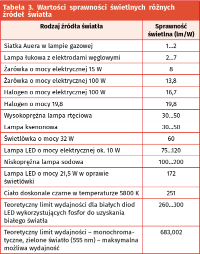 Dla oświetlenia najwięcej sensu ma definiowanie tzw. sprawności lub skuteczności świetlnej. Mówi ona o strumieniu świetlnym, jaki przypada na jednostkę mocy. Skuteczność tę wyraża się w lumenach na wat. Wyznaczenie tego parametru jest relatywnie proste, szczególnie na tym etapie – zmierzono już całkowity strumień świetlny analizowanej lampy oraz jej pobór mocy. Wystarczy podzielić przez siebie te dwie wartości, aby uzyskać sprawność świetlną. W tabeli 3 umieszczono listę różnych źródeł światła wraz z ich sprawnościami świetlnymi.