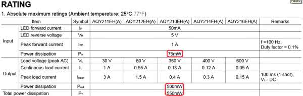 Inni producenci, jak Panasonic, wprost podają maksymalną moc cieplną wydzielaną w swoich SSR [7] (rysunek 5). Rozdzielenie dopuszczalnej mocy traconej na obwód wejściowy (diodę LED), wyjściowy (tranzystory PhotoMOS) i sumarycznej dla całego podzespołu znacznie ułatwia zaprojektowanie układu w taki sposób, aby zastosowane komponenty SSR pracowały w zakresie dopuszczalnych parametrów. Tutaj nie wolno wydzielić więcej niż 550 mW w obudowie DIP, co jest wartością znacznie bardziej zbliżoną do rzeczywistej niż w poprzednim przykładzie.