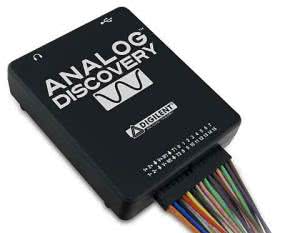 Analog Digilent - producent rewelacyjnego oscyloskopu USB - Analog Discovery (fotografia 7), który powstał na bazie podzespołów Analog Devices i przez tę firmę jest sponsorowany. W rzeczywistości jest to kompaktowe złożenie kilku przyrządów pomiarowych, takich jak: oscyloskop, generator arbitralny, zasilacz napięciowy, analizator stanów logicznych, generator cyfrowych przebiegów wzorcowych (patterns), rejestr statycznych wejść/wyjść, a także analizator pasma przenoszenia czwórników i woltomierz cyfrowy. Urządzenie nie ma gniazd BNC, a wszystkie wyprowadzenia wykonano jako przewody z łączówkami do złącz szpilkowych typu gold pin. Takie rozwiązanie nie ułatwia pracy użytkownikowi przyzwyczajonemu do wygody, jaką zapewnia oscyloskop klasyczny, ale niedogodność ta ginie w gąszczu zalet tego urządzenia.