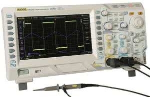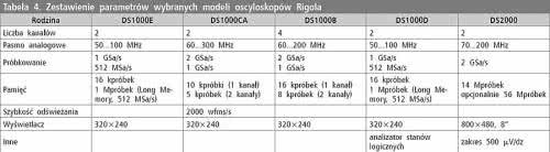 - Rigol. Tajemnicą Poliszynela jest sukces marketingowy oscyloskopu DS1052E (fotografia 11). Jest to oscyloskop o dość przeciętnych parametrach w porównaniu z równolegle oferowanymi przyrządami. Model ten nadal cieszy się olbrzymim powodzeniem, mimo że jest sprzedawany od kilku już lat. Prawdopodobnie producent i dystrybutorzy doskonale wstrzelili się z potrzebami głównie amatorów i małych warsztatów elektronicznych, idealnie wręcz ustalając cenę w stosunku do możliwości. Można chyba nawet zaryzykować stwierdzenie, że DS1052E rozsławił Rigola w Polsce i przełamał nienajlepszą zwykle opinię o wyrobach chińskich. Owszem, jest to firma azjatycka, ale wyraźnie prowadzona na amerykański styl. DS1052E ma dwa kanały pomiarowe. Pasmo analogowe jest chyba najmniejsze, jakie można zaakceptować dla współczesnych oscyloskopów stacjonarnych, czyli 50 MHz. Sytuację ratuje zaskakująco duża dla takiego pasma szybkość próbkowania wynosząca 1 GSa/s, a także gigantyczny wręcz rekord 1 Mpróbek, dzielony jednak na dwa kanały. Wadą wszystkich oscyloskopów Rigola serii nie większej niż 1000 jest dość kiepski, jak na dzisiejsze wymagania wyświetlacz z matrycą zaledwie 320×244 punkty. Parametry parametrów rodzin oscyloskopów Rigola zestawiono w tabeli 4. Warto zwrócić uwagę na modele z literą D w nazwie, oznacza ona bowiem, że oscyloskop jest wyposażony w analizator przebiegów cyfrowych. Z kolei rodzina DS2000 odznacza się bardzo małymi szumami. Najniższy zakres pomiarowy to zaledwie 500 mV/dz. Przykładowy oscyloskop z tej rodziny - DS2202 - pokazano na fotografii 12. Najwyższą klasę oscyloskopów Rigola mieszczącą się w założeniach dotyczących ceny stanowią 4 modele rodziny DS4000. Są to przyrządy 2- i 4-kanałowe o paśmie 100...200 MHz i próbkowaniem 4 GSa/s. Modele te charakteryzują się szybkością odświeżania rzędu 110000 wfms/s i rekordem 140 Mpróbek.