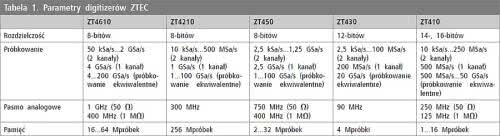 - ZTEC Instruments - oferuje digitizery (fotografia 1) obejmujące kilka serii, których wybrane modele i ich parametry zestawiono w tabeli 1. Są to urządzenia pracujące na magistralach PCI, PXI, VXI lub LXI. Dostarczane jest do nich bogate oprogramowanie i narzędzia software’owe oraz drivery m.in. LabView. Wszystkie urządzenia mają 2 lub 4 kanały pomiarowe i są wyposażone w procesory DSP pozwalają na zaawansowane przetwarzanie danych pomiarowych bezpośrednio na karcie.