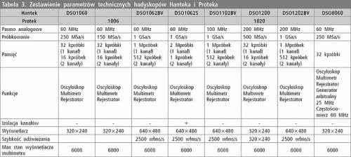 - Handyskopy firm Hantek i Protek są w zasadzie 100-procentowymi odpowiednikami. Mają nawet identyczny design, w którym zmieniono jedynie nazwę przyrządu i producenta. Co ciekawe, w materiałach reklamowych na wyrobach obu marek jest widoczny ten sam ekran (fotografia 9). Czyżby i tu ujawniła się siła PhotoShopa?. W oscyloskopach zastosowano wyświetlacze z matrycą 320×240 lub 640×480 punktów z podświetlaniem. Parametry poszczególnych modeli zestawiono w tabeli 3. Cechą wyróżniającą model Hantek DSO860 jest wbudowany generator arbitralny wytwarzający sygnał analogowy z 12-bitową rozdzielczością i maksymalną częstotliwością 25 MHz. Sygnał ten jest tworzony z próbek generowanych z maksymalną szybkością 200 MSa/s. Przydatnym rozszerzeniem w tym przyrządzie jest ponadto wbudowany częstościomierz mierzący sygnały do 60 MHz.