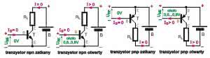 Istnieją tranzystory komplementarne, czyli typu NPN i PNP. Rysunek 1 przypomina schemat ich budowy.Tranzystory bardzo często pełnią rolę wzmacniaczy, ale pracują też jako elementy przełączające, pełniące rolę kluczy - sterowanych zaworów. Rysunek 2 pokazuje zasady ich sterowania w układach impulsowych. Przy napięciu UBE poniżej 0,5 V prąd bazy jest bliski zeru i tranzystor jest wtedy zatkany. Aby otworzyć tranzystor bipolarny, trzeba przez obwód bazy przepuścić prąd. Wtedy, zależnie od wartości prądu bazy, na złączu baza-emiter wystąpi napięcie 0,6...0,8 V.