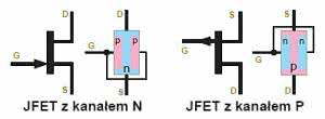 Wcześnie wynaleziono tranzystor polowy złączowy ( JFET - Junction Field Effect Transistor). Budowa i zasada działania, zilustrowana na rysunku 3 jest bardzo prosta. Prąd płynie między źródłem (S - Source) a drenem (D - Drain) przez tzw. kanał, wykonany z jednorodnego półprzewodnika. Elektrodą sterującąS jest bramka (G - Gate). W takich klasycznych tranzystorach JFET występuje złącze półprzewodnikowe pn, co znajduje odzwierciedlenie w symbolach graficznych tych tranzystorów. Spolaryzowanie tego złącza w kierunku wstecznym, zaporowym zwiększa rezystancję kanału, a tym samym zmniejsza prąd tranzystora. Złącze to w trakcie pracy nie może być spolaryzowane przepustowo, ponieważ wtedy popłynie prąd bramki, jak przez zwykłą diodę.