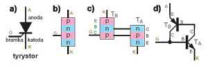 Na początku ery półprzewodnikowej elementami czynnymi (niezbyt) dużej mocy i elementami wysokonapięciowymi były wyłącznie tranzystory bipolarne (BJT). Choć tyrystory to odrębny temat, jednak warto wspomnieć o tych, wynalezionych w roku 1957, elementach dużej mocy. Zasada budowy i działania tyrystora jest bardzo prosta. To czterowarstwowy element npnp, który zachowuje się jak dwa połączone tranzystory - rysunek 5. Prąd bramki włącza "dolny" tranzystor TA, a jego przewodzenie otwiera też "górny" tranzystor TB i taki element się "zatrzaskuje" wskutek silnego dodatniego sprzężenia zwrotnego. Po zaniku prądu bramki tyrystor nadal przewodzi aż do zaniku prądu anodowego.