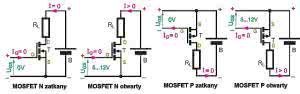 Co ważne, typowy tranzystor MOSFET jest normalnie zatkany (zamknięty). Przy zerowym napięciu elektrody sterującej - bramki, rezystancja kanału jest ogromna, a prąd praktycznie równy zeru. W przeciwieństwie do tranzystorów JFET, a podobnie jak w przypadku tranzystorów BJT, klasyczny MOSFET zostaje otwarty przez podanie na bramkę napięcia o "wygodnej polaryzacji". W przypadku MOSFET-a z kanałem N jest to napięcie dodatnie względem źródła, a dla tranzystorów z kanałem P - ujemne, jak pokazuje rysunek 7.