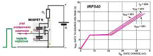 Obwód bramki MOSFET-a jest rodzajem kondensatora, dlatego sterowanie jest napięciowe. W warunkach statycznych prąd tam nie płynie - obwód bramki jest doskonały, nie zużywa energii. Jednak energia jest potrzebna podczas włączania i wyłączania. Zasadniczo MOSFET-y mocy są bardzo szybkie, jednak w praktyce realnym ograniczeniem jest konieczność przeładowania znacznej pojemności wejściowej CGS, wynoszącej od 1 nF do ponad 10 nF. Aby w pełni otworzyć typowego MOSFET-a, trzeba zmienić napięcie na jego bramce o około DU=10 V. Wskazuje to, że trzeba dostarczyć lub usunąć ładunek Q=DU×CGS. W rzeczywistości przeładowany ładunek musi być większy z uwagi na wpływ tzw. pojemności Millera między drenem i bramką. Dlatego w katalogach zamieszczane są charakterystyki przełączania jak na rysunku 8, pokazujące zmiany napięcia na bramce od zmiany ładunku bramki (Qg). Poziomy "schodek" wynika właśnie z wpływu pojemności Millera (CGD).