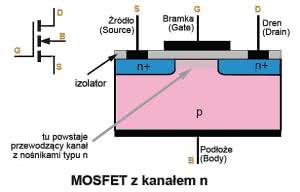 W podręcznikach najczęściej przedstawia się budowę MOSFET-a jak na rysunku 9. Początkujących dziwi fakt, że w tranzystorach MOSFET N półprzewodnik, w którym tworzy się przewodzący kanał jest typu P (analogicznie w MOSFET-ach P). Podanie na bramkę napięcia dodatniego powoduje "odepchnięcie" nośników obszaru typu p w bezpośrednim sąsiedztwie bramki, tak zwaną inwersję i wytworzenie przewodzącego kanału z nośnikami typu n. Wtedy zależnie od napięcia bramki, różna jest szerokość i rezystancja kanału powstałego między źródłem i drenem. W praktyce ważna jest minimalna rezystancja w pełni otwartego tranzystora, oznaczana RDSon.