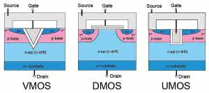 Tak zbudowany jest tzw. MOSFET lateralny, o budowie "poziomej", gdzie prąd drenu płynie "poziomo". Natomiast przy budowie tranzystorów MOSFET mocy wykorzystuje się bardziej złożone struktury "pionowe", przez co powstaje też dodatkowa dioda między źródłem i drenem. Pierwsze tranzystory MOSFET były nazywane VMOS, gdzie litera V wskazywała na budowę kanału. Później ulepszono parametry zmieniając strukturę wewnętrzną - pojawiły się tranzystory DMOS. Dzisiejsze MOSFET-y często są określane mianem UMOS lub TrenchMOS, przy czym istnieje mnóstwo rozwiązań konstrukcyjnych, stosowanych przez poszczególnych wytwórców. Rysunek 10 pokazuje wspomniane schematy budowy.