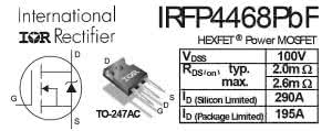 Jeden z pierwszych MOSFET-ów, oznaczony IRF100, wypuszczony w roku 1978 miał dopuszczalne napięcie UDS=100 V i rezystancję w stanie otwarcia RDSon równą 0,1 V (100 mV). Współczesny, 100-woltowy tranzystor IRLS4030-7PPbF tej samej firmy ma rezystancję RDSon typowo 3,2 mV, maksymalnie 3,9 mV. Natomiast 100-woltowy, 520-watowy IRFP4468PbF (rysunek 11) typowo ma RDSon 2 mV, maksymalnie 2,6 mV. Dopuszczalny prąd impulsowy to 1120 A. Ciągły prąd struktury mógłby wynosić 290 A, ale rezystancja wyprowadzeń ogranicza go do 195 A.