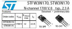 Na rysunku 16 pokazano, że ze wzrostem dopuszczalnego napięcia UDS poważnie rośnie rezystancja charakterystyczna RDSon. Zależność nie jest liniowa, tylko wykładnicza i łatwo się domyślić, że MOSFET-y o wysokim napięciu pracy nie będą mieć dobrych parametrów. Już tu widać powód, dla którego rzadkością są MOSFET-y o napięciu UDS powyżej 600 V. Choć można spotkać typy o napięciu nawet 1500 V, na przykład w ofercie ST (http:// goo.gl/fGX74T), w której zapowiadane są też MOSFET-y 1700-woltowe (STFW3N170, STW3N170) - rysunek 17. Przy tak wysokim napięciu nie można się spodziewać rewelacji: jak widać rezystancja RDSon jest duża, maksymalnie 12 W, a ciągły prąd drenu to 2,3 A przy nierealnie małej temperaturze obudowy 25°C i tylko 1,45 A przy realnej temperaturze obudowy 100°C.