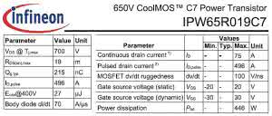 Tak ulepszone tranzystory, zwane najczęściej Super Junction MOSFET (SJMOS) są dostępne na rynku. Fotografia 20 pokazuje elementy rodziny Infineon CoolMOS, a rysunek 21 to fragmenty karty katalogowej CoolMOS IPW65R019C7 o napięciu 650 V, prądzie 75 A (w impulsie 496 A), który ma rezystancję RDSon tylko 0,019 W.