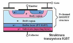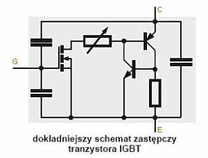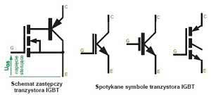 IGBT (Insulated Gate Bipolar Trasnsistor) to inaczej tranzystor bipolarny z izolowaną bramką. Rysunek 22 pokazuje uproszczony schemat zastępczy i spotykane symbole tranzystora IGBT. Tranzystory takie zostały wynalezione w latach osiemdziesiątych, a na rynku stały się dostępne w latach dziewięćdziesiątych. Są to tranzystory dużej mocy, łączące zalety MOSFET-ów (łatwość sterowania) i klasycznych bipolarnych tranzystorów złączowych BJT (duży prąd i napięcie pracy, małe napięcie nasycenia). Są one sterowane napięciowo, tak jak MOSFET-y, więc wyeliminowana zostaje główna wada bipolarnych tranzystorów wysokonapięciowych - konieczność zapewnienia dużego prądu bazy. Jednocześnie pozostaje główna zaleta tranzystorów bipolarnych - wysokie napięcie pracy oraz stosunkowo małe napięcie nasycenia przy dużych prądach przewodzenia.