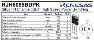 Rysunek 25 pokazuje fragmenty karty katalogowej Renesas RJH6088BDPK w klasycznej obudowie TOP-3, o napięciu 600 V i prądzie 60 A i mocy strat ponad 260 W.