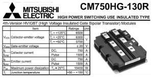 Oprócz tranzystorów IGBT w klasycznych obudowach, dostępne są też wersje o dużych prądach oraz moduły, zawierające dwa lub więcej tranzystorów IGBT. Fotografia 27 pokazuje tranzystor z trzema równolegle połączonymi strukturami, Infineon FZ3600R17KE3, o napięciu pracy 1700 V, prądzie maksymalnym 4800 A (w impulsie 7200 A), o mocy strat 18 kW (!), mający wymiary 190 mm×140 mm×38 mm. Dostępne są też potężniejsze moduły o napięciu UCE=6500 V i prądach sięgających 1000 A. Rysunek 28 pokazuje tranzystor Mitsubishi CM750HG-130R 6500 V o prądzie ciągłym 750 A (w impulsie 1500 A). Jak wskazuje strona http:// goo.gl/KXzJiI cena takiego tranzystora przekracza 10000 złotych. Nie są to ceny dla hobbystów, ale też hobbyści nie mają potrzeb pracy z napięciami rzędu kilku kilowoltów i prądami rzędu kiloampera. Tranzystor IGBT o napięciu kilkuset woltów i prądzie kilkudziesięciu amperów można kupić w sklepie za kilkanaście, najwyżej kilkadziesiąt złotych. Na giełdach i aukcjach można kupić tranzystory i moduły IGBT z demontażu po bardzo atrakcyjnych cenach, więc nawet potężne IGBT są dziś także w zasięgu hobbystów - byle potrafili je sensownie wykorzystać.