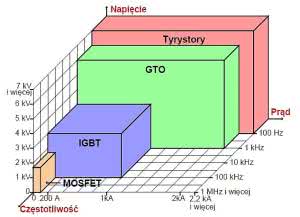 Rysunek 31 pokazuje przybliżony zakres "możliwości" tranzystorów bipolarnych, MOSFET-ów oraz tyrystorów zwykłych i GTO. Tymczasem nieustannie rośnie zapotrzebowanie na coraz szybsze elementy przełączające.
