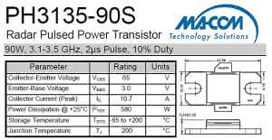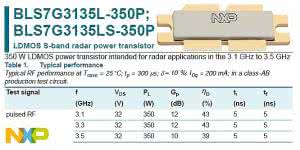 Dziś na rynku dostępne są rozmaite elementy mikrofalowe, w szczególności bipolarne tranzystory Si, SiGe i GaAs HBT, a także unipolarne krzemowe LDMOSFET praz MESFET i pHEMT z innych półprzewodników, głównie z GaAs. Do pracy w niższych zakresach mikrofalowych wykorzystuje się tanie tranzystory krzemowe BJT i krzemowe MOSFET- y. Dostępne są klasyczne tranzystory krzemowe BJT (NPN) przeznaczone do pracy przy częstotliwościach rzędu 3,5 GHz. Przykładem może być kilkunastowatowy ASI3005 (Advanced Semiconductor - http://goo.gl/ H3paGp) czy znacznie potężniejszy PH3135- -90S z M/A-COM Technology Solutions - rysunek 32. Oprócz bipolarnych, dostępne są też krzemowe MOSFET-y przeznaczone do pracy przy wysokich częstotliwościach, ale nie jako tranzystory przełączające, tylko jako wzmacniacze sygnałów radiowych. Nazywane są LDMOS (Lateral Diffusion MOSFET). Jest to specyficzna wersja bardzo popularnych MOSFET-ów N normalnie zamkniętych. Przykładem może być MRF6P24190HR6 Freescale o mocy 190 watów, pracujący w zakresie do 2,5 GHz - rysunek 33. Inny przykład to tranzystor NXP BLS7G3135L-350P o mocy 350 W - rysunek 34. Przy wyższych częstotliwościach dominują tranzystory z arsenku galu (GaAs) oraz krzemowo-germanowe (SiGe). Krzem ma liczne zalety, ale też wady. Dlatego też krzem nie wyeliminował całkowicie na pozór dużo gorszego germanu. German (Ge) niejako wrócił do gry, ale nie tyle w postaci elementów "czysto germanowych", tylko w postaci tranzystorów heterozłączowych SiGe. Od wielu lat do budowy tranzystorów bardzo wysokiej częstotliwości wykorzystuje się też arsenek galu (GaAs), stosowany w elementach optoelektronicznych.