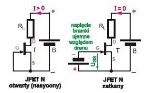 Istotną wadą praktyczną tranzystorów JFET jest fakt, że są to tranzystory normalnie otwarte. Czyli przy zerowym sygnale sterującym przewodzą prąd. Aby je zatkać, trzeba podać "niewygodne napięcie" - w przypadku tranzystorów JFET z kanałem N, zasilanych napięciem dodatnim, napięcie sterujące musi być ujemne o wartości kilku woltów, co ilustruje rysunek 4. Aby taki tranzystor otworzyć, trzeba podać napięcie sterujące równe zeru, czyli zewrzeć bramkę ze źródłem (można też podać niewielkie napięcie dodatnie, co najwyżej 0,5 V, by nie popłynął prąd bramki).