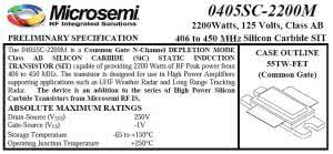 Rysunek 43 to fragmenty karty katalogowej Microsemi 0405SC-2200M. Jest to Silicon Carbide SIT, czyli odmiana tranzystora FET zwana SIT (Static Induction Transistor). Tranzystor ten ma napięcie pracy do 250 V, moc w impulsie ponad 2 kW, a struktura z węglika krzemu może pracować w temperaturze nawet +250°C.
