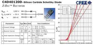 Zanim w roku 2008 pojawił się pierwszy przełączający tranzystor SiC (JFET), a potem MOSFET SiC 2011), wcześniej wypuszczono na rynek diody SiC. Łatwo się domyślić, że diody z materiału o dużo większej szerokości przerwy energetycznej będą mieć dużo większe napięcie przewodzenia, co oczywiście jest istotną wadą, bo powiększa straty mocy. Owszem, dlatego też oferowane na rynku diody SiC nie są "zwykłymi" diodami pn, tylko diodami Schottky-ego ze złączem metal-półprzewodnik. W związku z wykorzystaniem nośników większościowych dioda jest bardzo szybka, nie ma problemu akumulacji ładunku (reverse recovery charge), pojemność diody jest mała. O ile krzemowe diody Schottky- -ego mają dopuszczalne napięcia wsteczne do 100 V, o tyle diody SiC mają napięcia wsteczne nawet ponad 1000 V. Co ciekawe, napięcie przewodzenia nie jest dużo wyższe, niż w klasycznych krzemowych diodach wysokonapięciowych. Przykładem może być podwójna dioda Cree C4D40120D o napięciu wstecznym 1200 V, prądzie ciągłym 2×27 A (w impulsie do około 2×100 A). Jak pokazuje rysunek 44, typowe napięcie przewodzenia przy prądzie 20 A wynosi 1,5 V w temperaturze +25°C i 2,2 V w maksymalnej temperaturze +175°C (współczynnik cieplny jest dodatni).