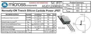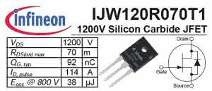 Pierwsze tranzystory SiC nie znalazły bezpośredniego zastosowania w układach przełączających z uwagi na kłopoty ze sterowaniem - były to tranzystory JFET normalnie otwarte. Aktualnym przykładem tego typu tranzystora jest Micross ASJD1200R085 - rysunek 45. Ma dopuszczalne napięcie pracy 1200 V, prąd drenu do 50 A, a pojemność wejściowa jest mała, poniżej 1 nF. Napięcie odcięcia bramki wynosi, zależnie od egzemplarza, -6 V...-4 V, a z uwagi na znaczne napięcie przewodzenia złącza bramkowego, element może też pracować przy niedużych dodatnim napięciu bramki, jak pokazuje rysunek 46. Więcej szczegółów na temat tego elementu można znaleźć w karcie katalogowej na stronie http://goo.gl/DBtCMU. W ofercie Infineon można znaleźć m.in. tranzystor IJW120R070T1 z rodziny CoolSiC (fotografia 47), który też jest normalnie otwartym JFET-em SiC. Rysunek 48 to fragmenty karty katalogowej.