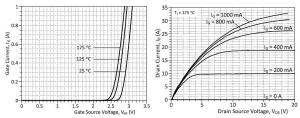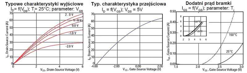 Przykładem zubożonego MOSFET-a z kanałem N dużej mocy (do 530 W) może być IXYS IXTH16N10D2. Jak pokazano na rysunku 15, przy zerowym napięciu bramki jest otwarty (zielone krzywe), a w przeciwieństwie do JFET-ów i MESFET-ów, może także pracować przy dużych dodatnich napięciach bramki (czerwone krzywe).