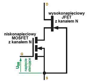 Do układów impulsowych potrzebne są tranzystory normalnie zamknięte, sterowane jak klasyczne MOSFET-y. Z uwagi na niewątpliwe zalety SiC, najpierw zaproponowano rozwiązanie hybrydowe, gdzie współpracują niskonapięciowy MOSFET i normalnie otwarty JFET SiC według rysunku 49. JFET ma napięcie odcięcia rzędu kilku, maksymalnie kilkunastu woltów. Jeśli jego bramka jest uziemiona, to przy zatkanym na tranzystorze MOSFET, napięcie na nim i na źródle tranzystora JFET wyniesie właśnie te kilka do kilkunastu woltów. Natomiast, gdy "dolny" MOSFET zostanie otwarty, wtedy zewrze źródło JFET-a do masy, a tym samym go otworzy.