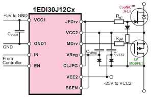 Rozwiązanie jest proste, ale ma pewne wady. Dlatego na przykład Infineon do swoich normalnie otwartych JFET-ów SiC proponuje scalony sterownik 1EDI30J12Cx i wykorzystanie MOSFET-a z kanałem P według rysunku 50. Dzięki sprytnemu sterowaniu, podczas przełączania, tranzystor JFET SiC jest... stale otwarty, a zamyka się i otwiera tylko niskonapięciowy MOSFET P. Warto zapoznać się ze szczegółami i na stronie http://goo.gl/eVzFCx wpisać w wyszukiwarkę hasło: 1EDI30J12Cx.