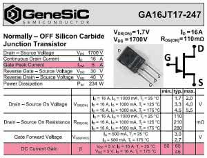 Innym przykładem tranzystorów SiC normalnie zatkanych są tranzystory SJT firmy GeneSiC. GA16JT17-247 ma napięcie maksymalne 1700 V, prąd do 16 A, RDSON=0,11 V i bardzo krótkie czasy przełączania, rzędu kilkudziesięciu nanosekund. Jednak dane z karty katalogowej - rysunek 52 - wskazują, że to jakiś "dziwoląg". Nie chodzi tylko o dziwaczny symbol tego tranzystora. Otóż wygląda to na tranzystor polowy, a podane są zaznaczone różowymi podkładkami: maksymalny prąd bramki (Gate Peak Current) oraz... wzmocnienie prądowe (DC Current Gain)! I rzeczywiście. Chodzi o SiC SJT ("Super" Junction Transistor), który jest bipolarnym tranzystorem BJT NPN o "superwysokim" wzmocnieniu prądowym. Są one dostępne na rynku http://goo.gl/xO4N2i.
