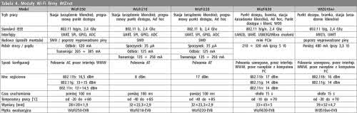 Trzecią, oddzielną grupę, stanowią moduły Wi-Fi. Tu różnice są dosyć znaczące, gdyż dobierając moduł można zaoszczędzić, ograniczając się do wsparcia jedynie starszych odmian standardu IEEE802.11. Poszczególne moduły mogą też pełnić różne funkcje. Oprócz podstawowych trybów pracy, tj. jako stacja kliencka lub punkt dostępowy, modele takie jak WizFi630 mogą np. pracować w trybie WDS, bramka, czy Ad hoc. Projektując urządzenie należy się zastanowić, czy jest sens wspierania takich trybów połączeń, czy też warto pozostać jedynie przy pracy w ramach stworzonej, stałej infrastruktury sieci Wi-Fi.