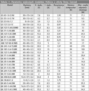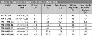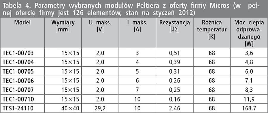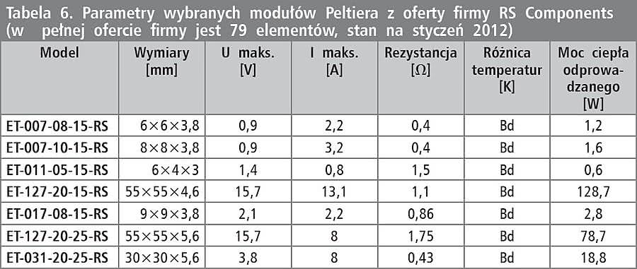 Wśród firm współpracujących z EP moduły Peltiera przeznaczone do chłodzenia układów elektronicznych małej mocy mają w swojej ofercie Micros, TME, Farnell, RS Components i Conrad. Zestawienie wybranych produktów dostępnych w ofercie firm zamieszczono w tabelach 3...8.